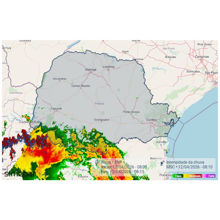 Esta manhã apresenta bastante cobertura de nuvens e chuva mais concentrada nas regiões Sudoeste e Centro-Sul, até o momento sem registros de acumulados expressivos. No Oeste Paranaense, a instabilidade aumenta gradualmente, com ocorrência de pancadas de chuva e algumas trovoadas localizadas, como as registradas em Foz do Iguaçu. Por enquanto, as instabilidades mais intensas estão localizadas entre o Paraguai e a Argentina. A imagem a seguir mostra as refletividades dos radares meteorológicos e as descargas atmosféricas, indicando, por meio das cores, a ocorrência de chuva — quanto mais quentes as tonalidades, mais intensa é a precipitação.
