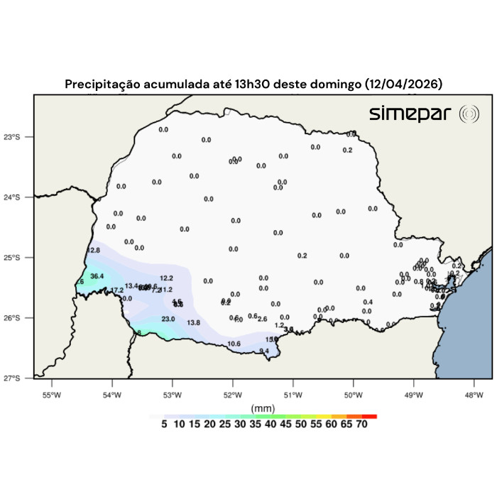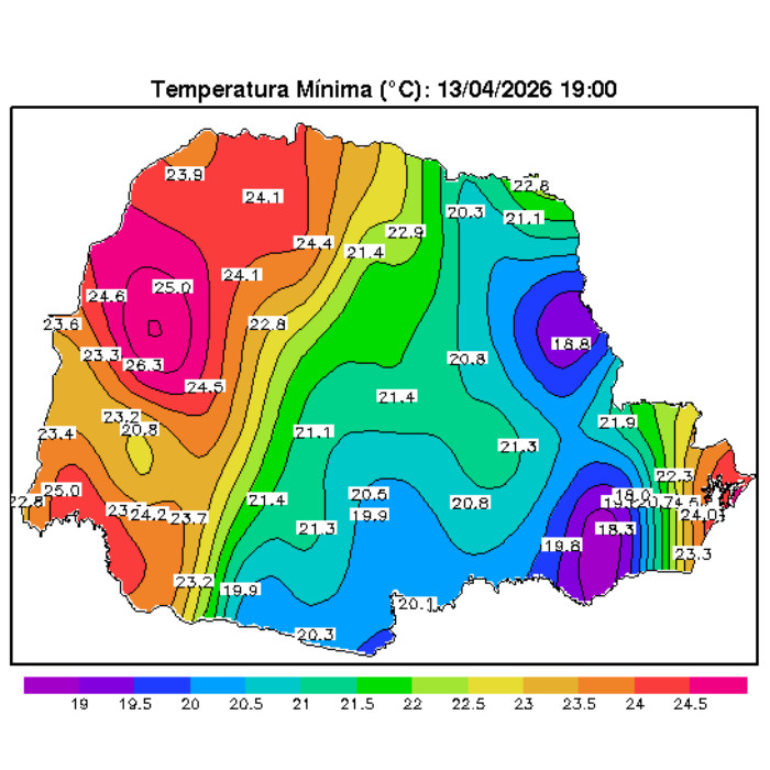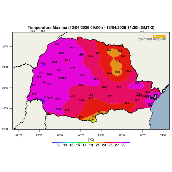 Durante o período da tarde, as temperaturas mais elevadas registradas no estado concentraram-se nas regiões oeste e litorânea, com valores superiores a 27 °C. Destacam-se as estações de Baixo Iguaçu (Capanema), com máxima de 30 °C, e Altônia, com 29,6 °C, aproximando-se dos 30 °C no decorrer da tarde. Por outro lado, a menor temperatura máxima observada no estado foi registrada em General Carneiro, com 17,9 °C. Ressalta-se também o setor norte paranaense, onde a estação de Ventania apresentou temperatura máxima de 20,9 °C.