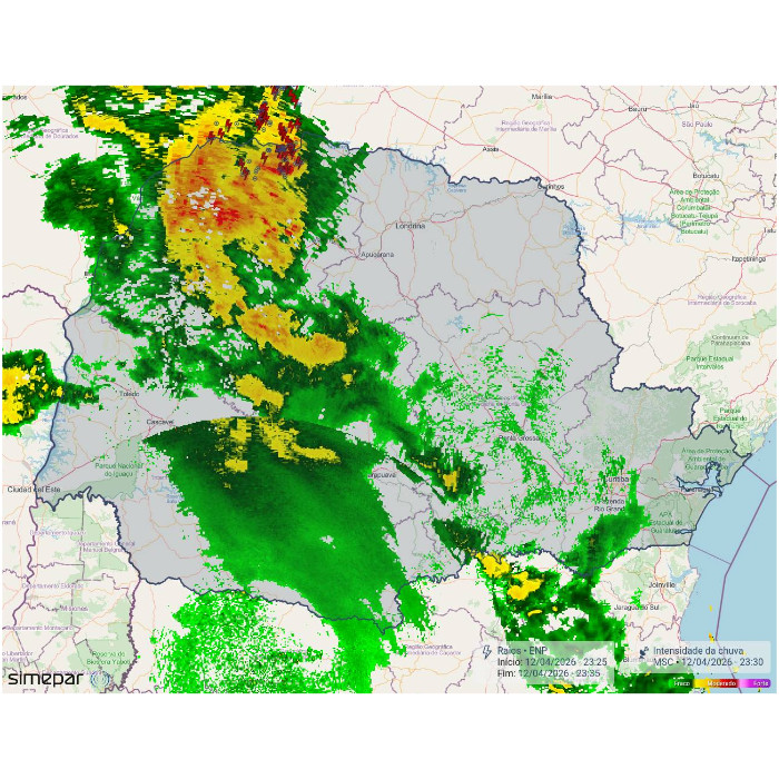 Com o deslocamento de sistemas meteorológicos em direção ao Paraná, os índices de instabilidade se elevaram condicionando o ambiente para formação de chuvas e temporais no Sudoeste, Oeste e Noroeste do estado. A chuva persistente, desde o período da manhã, traz acumulados acima dos 40 mm em municípios como: Candói (41,0 mm), Francisco Beltrão (41,8 mm), Quedas do Iguaçu (42,4 mm), Foz do Iguaçu (44,6 mm), São Miguel do Iguaçu (49,0 mm), Cruzeiro do Iguaçu (49,4 mm), Santa Helena (49,4 mm), Toledo (61,0 mm) e Ouro Verde do Oeste (76,8 mm). No momento, fortes tempestades atingem a região entre Douradina, Tapira e Nova Olímpia, com elevado risco para queda de granizo e ventos fortes. Fique atento aos alertas da Defesa Civil! Os temporais seguem nas próximas horas no Oeste e Noroeste paranaense, se estendendo de forma irregular ao Norte Central.