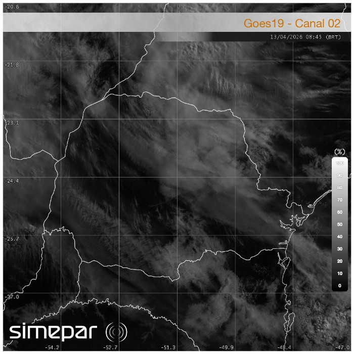 Neste momento, a imagem de satélite do canal de vapor d’água evidencia maior concentração de umidade sobre o Sul do Brasil, com destaque para o Rio Grande do Sul, onde se observam áreas mais organizadas de nebulosidade associadas a um sistema de baixa pressão atuando sobre países vizinhos. No Paraná, por enquanto, o tempo permanece estável. Pancadas de chuva isoladas começam a se formar pelo Sudoeste. A tendência, nas próximas horas, é de avanço dessas instabilidades de sudoeste para nordeste, ao longo deste domingo, favorecendo o retorno gradual das chuvas ao estado.