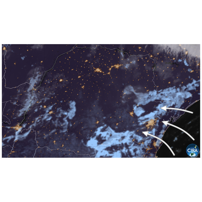 Após um domingo marcado por instabilidades e chuvas volumosas, principalmente nas regiões Noroeste, Oeste e Sudoeste do Paraná, a madrugada ainda apresenta áreas de instabilidade sobre o estado, conforme indicado pela imagem de satélite do canal infravermelho. Os núcleos mais intensos avançaram em direção ao oeste de São Paulo ao longo das últimas horas. No Paraná, no entanto, ainda há ocorrência de chuva, de forma mais irregular e com menor intensidade em relação ao período da tarde.